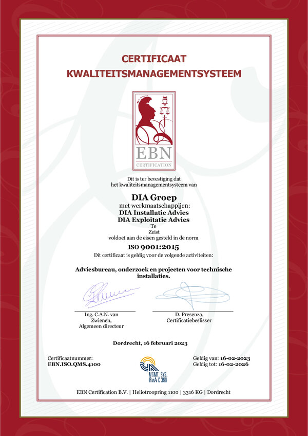 DIA Groep, het ingenieursbureau dat is gespecialiseerd in installatie- en exploitatie advies, heeft onlangs het ISO9001 en ISO14001 certificaat behaald. DIA Groep voldoet hierdoor aan de internationale norm die deze certificering is voor Kwaliteitsmanagementsystemen en Milieumanagement systemen.